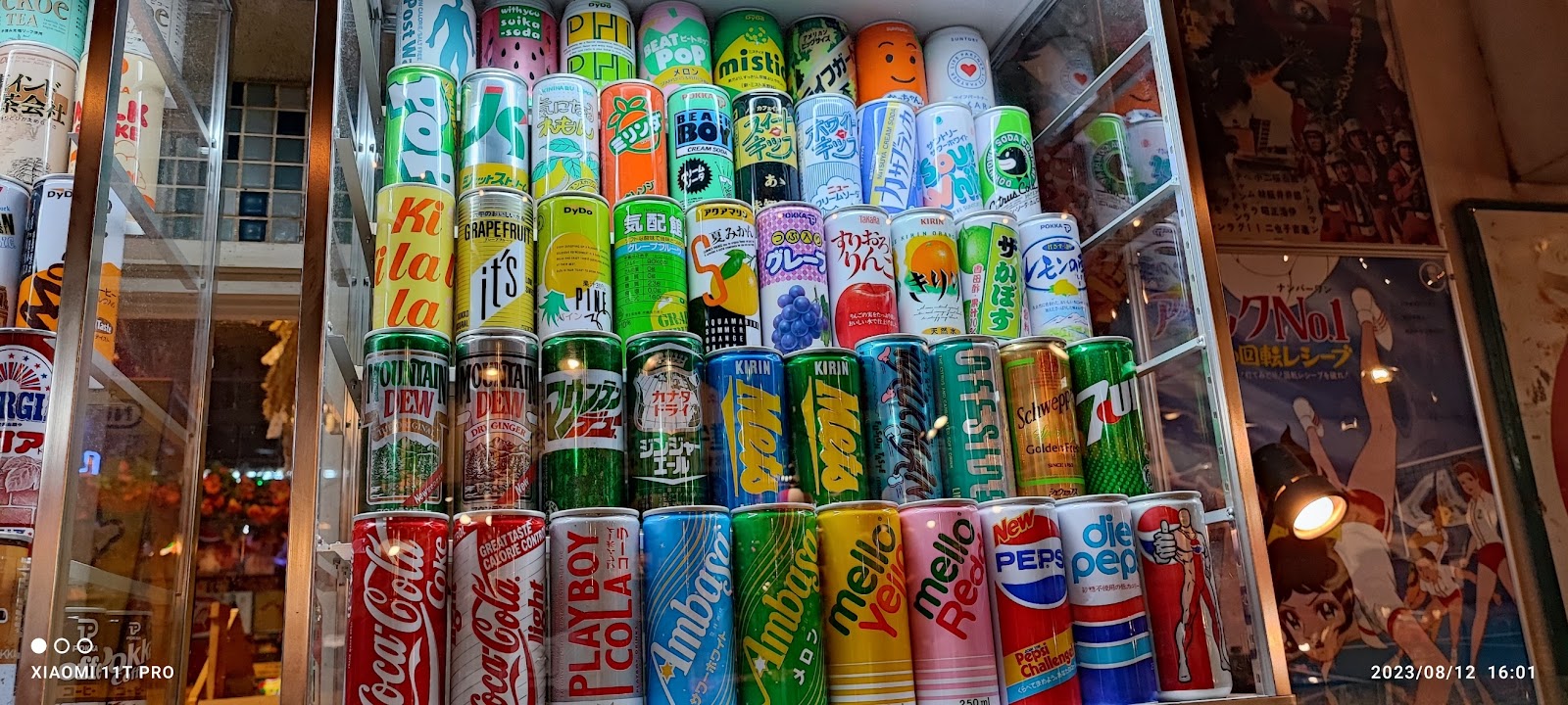 その懐かしさ溢れる道を歩いた先にお目にかかる一丁目プレイランド外部のケース内に収められたジュース群も懐かしい気分になれること請け合いです。